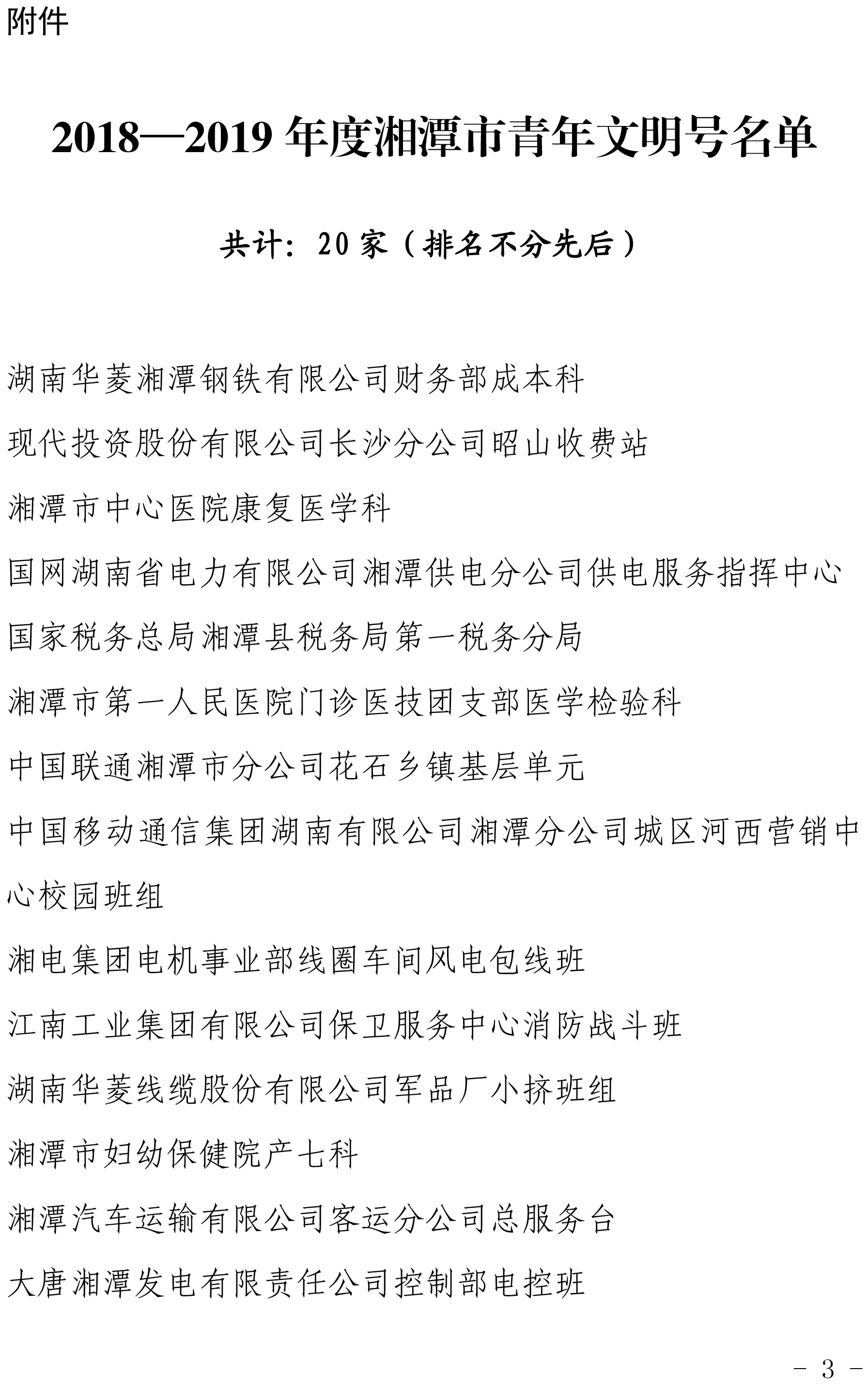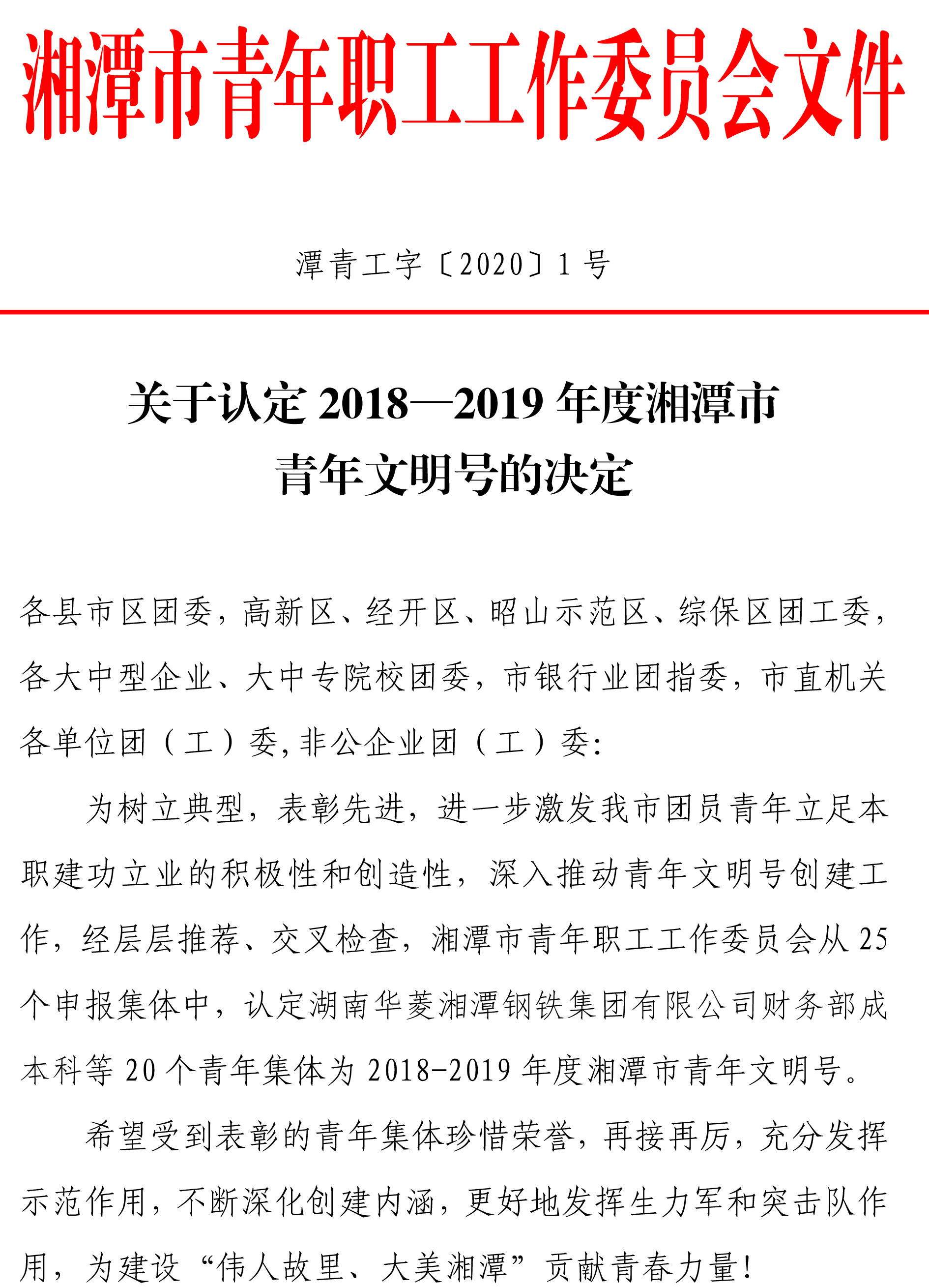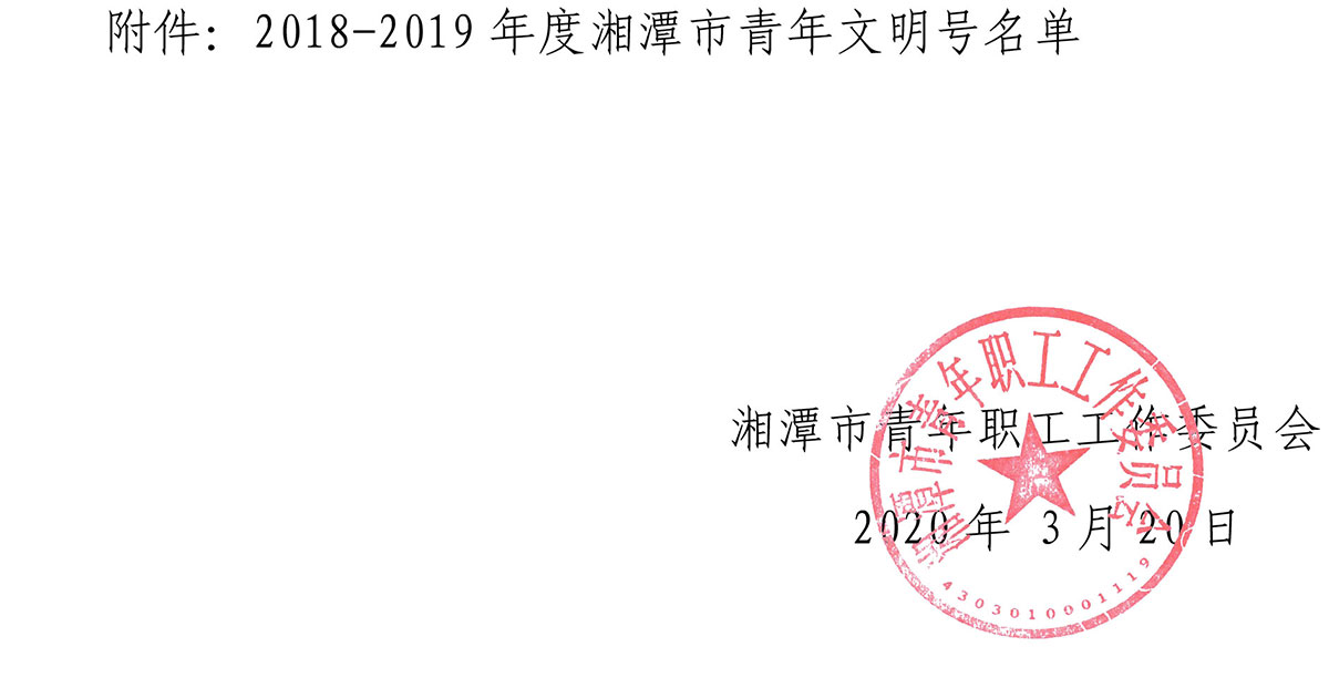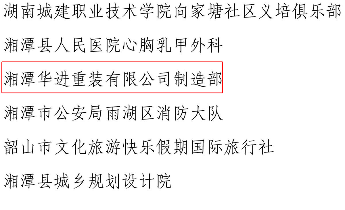 為樹立典型,表彰先進,進一步激發湘潭市團員青年立足本職建功立業的積極性和創造性,深入推動青年文明號創建工作,經層層推薦、交叉檢查,湘潭市青年職工工作委員會從 25個申報集體中,認定湘潭華進重裝有限公司制造部等 20 個青年集體為 2018-2019 年度湘潭市青年文明號。